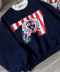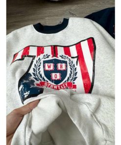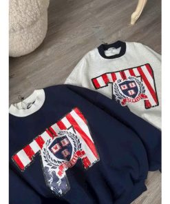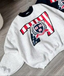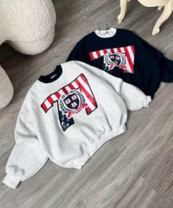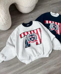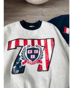 Tên sản phẩm: ÁO SWEATER VẢI NỈ BÔNG CỔ TRÒN PHỐI CỔ KHÁC MÀU IN NỔI SỐ 77 SỌC CỜ UNISEX NAM NỮ TP39 – GOLDEN DREAM