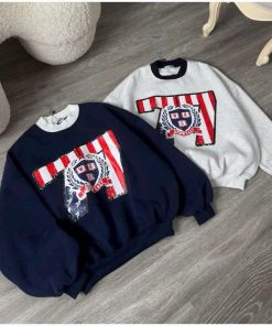 Tên sản phẩm: ÁO SWEATER VẢI NỈ BÔNG CỔ TRÒN PHỐI CỔ KHÁC MÀU IN NỔI SỐ 77 SỌC CỜ UNISEX NAM NỮ TP39 – GOLDEN DREAM