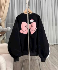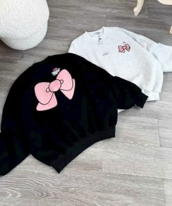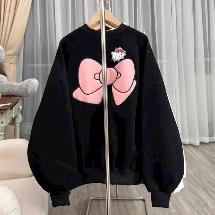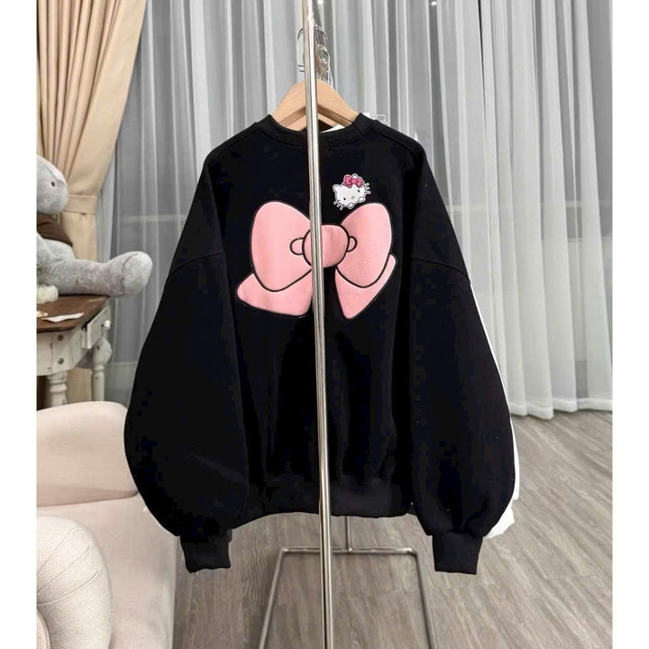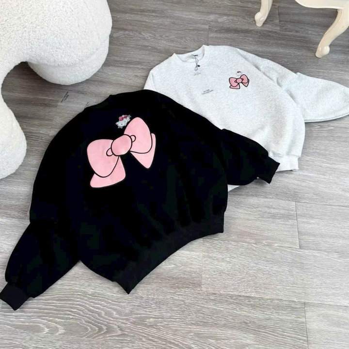 Áo sweater nơ hồng phong cách dễ thương là lựa chọn hoàn hảo cho những ai yêu thích sự trẻ trung, mềm mại và nổi bật. Thiết kế gồm hai phiên bản màu đen và xám sáng, mỗi chiếc đều mang điểm nhấn là họa tiết nơ hồng lớn đáng yêu phía trước, tạo cảm giác ngọt ngào nhưng vẫn cá tính. Chất liệu nỉ bông dày dặn, mềm mịn, giữ ấm tốt và mang lại cảm giác thoải mái khi mặc trong những ngày thời tiết se lạnh.