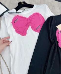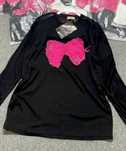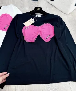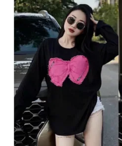 -Tên Sản phẩm: Áo thu đông, Áo dài tay thêu hình nơ màu hồng cổ tròn form rộng