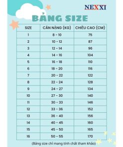 * Size 11 : Cân nặng 30-33kg, chiều cao 146cm