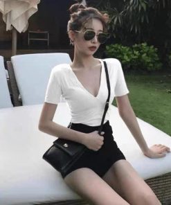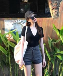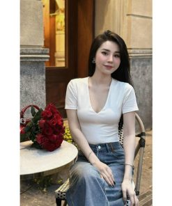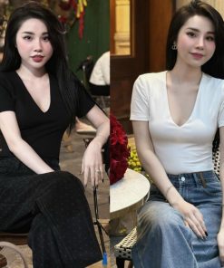 ÁO THUN TAY NGẮN CỔ KHOÉT V DÁNG DÀI NỮ TRƠN ÔM BODY UG378- SAM FREESIZE < 51KG
