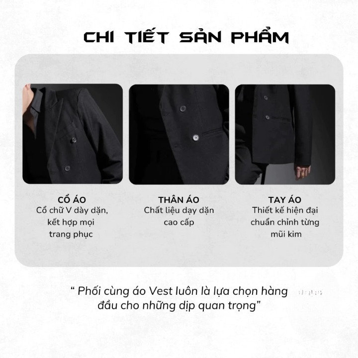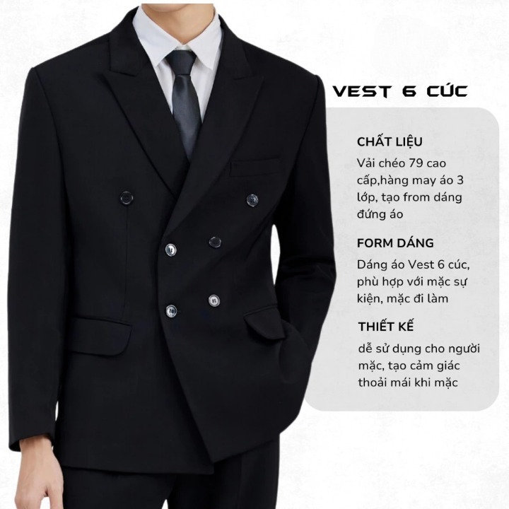 ✨ ĐIỂM NHẤN NỔI BẬT ✨ Áo Vest 6 cúc (Double Breasted) là biểu tượng của sự sang trọng và quyền lực nhưng vẫn giữ được nét trẻ trung. Với form dáng Regular chuẩn Hàn Quốc, đây là lựa chọn hoàn hảo cho các quý ông diện đi làm, dự tiệc hay những sự kiện quan trọng.
