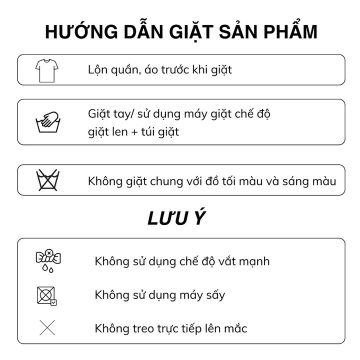 Phơi đồ: Lộn trái áo khi phơi, tránh ánh nắng trực tiếp để giữ màu sắc bền bỉ.