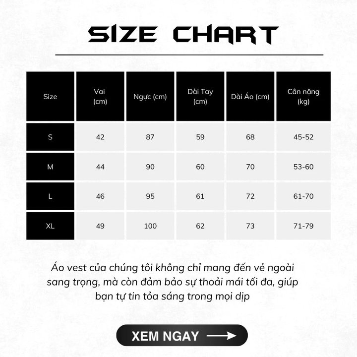 (Bạn hãy điền thông số cân nặng/chiều cao cụ thể vào đây để khách hàng dễ lựa chọn nhé)
