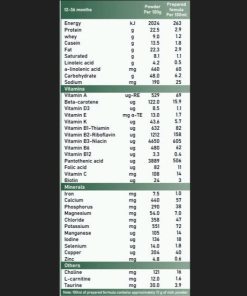 Bột sữa gầy, lactose (từ sữa), hỗn hợp dầu thực vật (dầu đậu nành, dầu cọ, dầu hướng dương giàu oleic, dầu dừa), whey protein cô đặc (từ sữa), bột whey tách khoáng (sữa), chất nhũ hóa (lecithin đậu nành), choline, taurine, L-carnitine, khoáng chất (kali clorua, magiê clorua, sắt sunfat, canxi cacbonat, di-kali hydro orthophosphate, canxi hydro orthophosphate, natri clorua, tri-kali citrate, tri-natri citrate, kẽm sunfat, đồng sunfat, mangan sunfat, kali iodide, natri selenite), vitamin (vitamin C, vitamin E-Acetate, vitamin B2, vitamin A-Acetate, vitamin D3, vitamin B3, vitamin B5, vitamin B12, vitamin K1, vitamin B1, vitamin B6, axit folic, biotin, beta caroten).