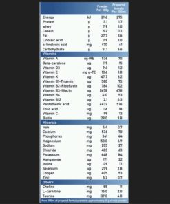 Bột sữa gầy, bột whey tách khoáng (sữa), hỗn hợp dầu thực vật (dầu đậu nành, dầu cọ, dầu hướng dương giàu oleic,(dầu dừa), lactose (từ sữa), whey protein cô đặc (từ sữa), chất nhũ hóa (lecithin dậu nành), DHA (từ dầu cá ngừ), choline, taurine, L-carnitine, lutein, các khoáng chất (canxi hydrogen orthophosphate, magiê clorua, canxi cacbonat, di-kali hydrogen orthophosphate, kali clorua, natri clorua, tri-kali citrate, tri-natri citrate, sắt sunfat, kẽm sunfat, đồng sunfat, mangan sunfat, kali iodua, natri selenite), các vitamin (vitamin C, vitamin E-Acetate, vitamin A-Acetate, vitamin B2, vitamin B3, vitamin D3, vitamin B5, vitamin K1, vitamin B12, vitamin B1, vitamin B6, axit folic, biotin, beta caroten).