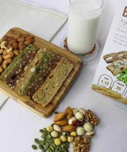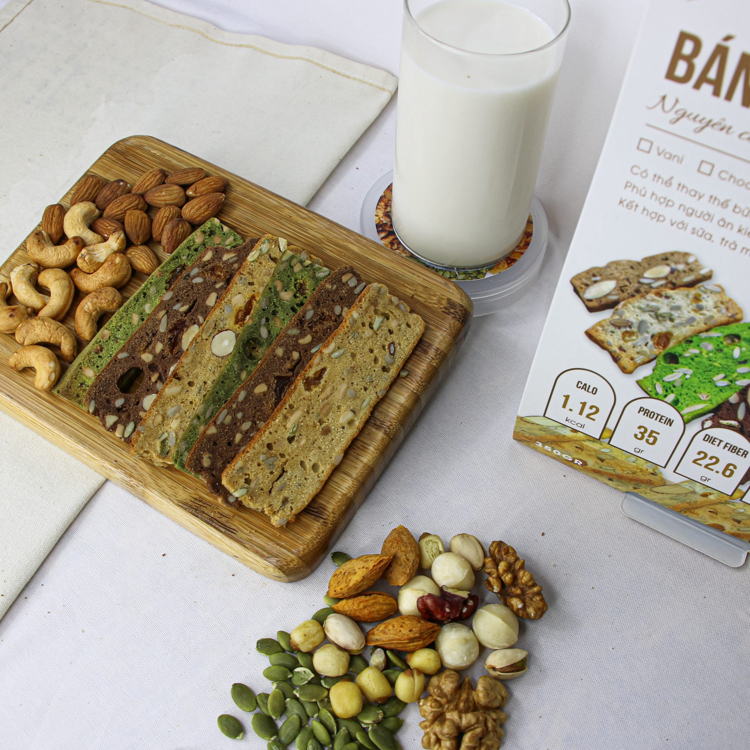 - Thành phần: Bột nguyên cám, hạt dinh dưỡng bao gồm hạnh nhân, điều, óc chó, hướng dương