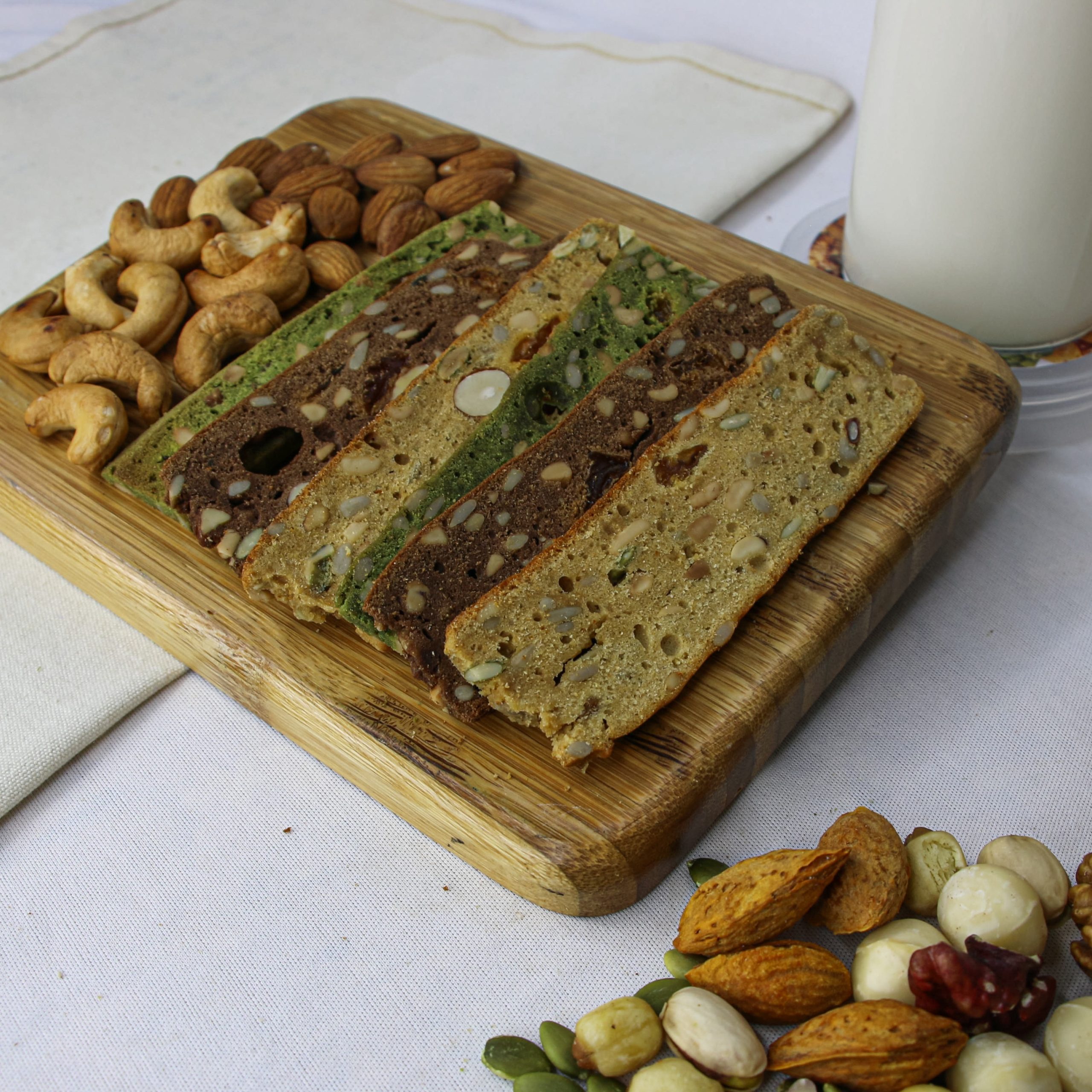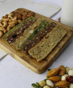 - Bánh được làm từ bột nguyên cám, hạt dinh dưỡng bao gồm hạnh nhân, điều, óc chó, hướng dương.