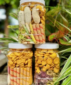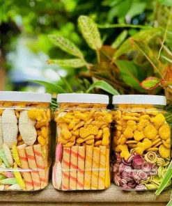 Bánh được mix với nhiều loại bánh tuổi thơ: quy mặn, ống kem, men cốt dừa, tai heo nhí,..
