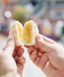 - Phần nhân ngọt là sự kết hợp độc đáo của nhiều nguyên liệu: Đậu xanh được nghiền nhuyễn với đường cát trắng, trứng muối là thành phần không thế thiếu tạo mùi thơm đặc trưng cho bánh.
