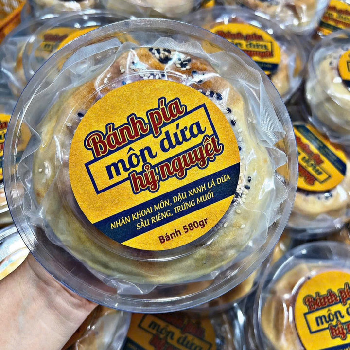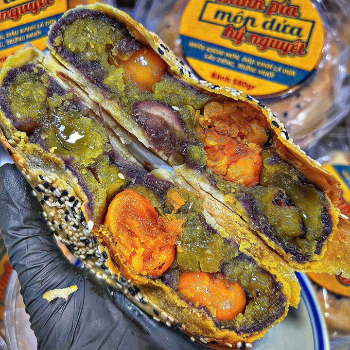 ✨ Bánh 580gr với nhân môn dứa, sầu riêng, trứng muối béo mặn quyện hòa cùng vỏ pía mè lột da truyền thống, nướng vàng óng, thơm lừng.
