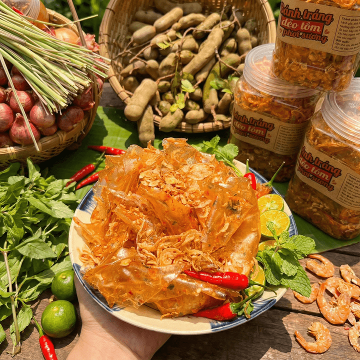 Bánh tráng dẻo phơi sương mềm – dai vừa phải, trộn cùng tôm cháy thơm lừng, hành phi giòn rụm, muối tôm đậm đà chuẩn vị.
