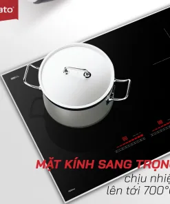 - Mặt kính thiết kế sang trọng, chịu nhiệt lên tới 700°C, chống trầy xước, chống bám dầu mỡ, vệ sinh dễ dàng.