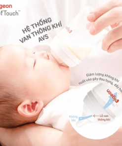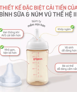 – Bình sữa sử dụng núm ty Pigeon SofTouch, chứa van thông khí AVS chống đầy hơi sặc sữa. Bên cạnh đó, đường khớp ngậm độc đáo trên núm ty còn giúp bé xác định vị trí ty đúng, nhờ đó việc ty sữa cũng trở nên dễ dàng và hợp tác hơn.