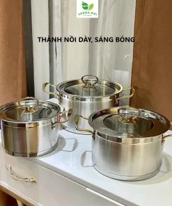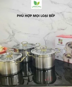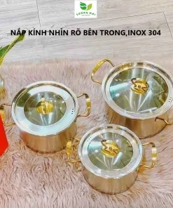 - Bộ nồi inox 304 tay vàng, đế 5 lớp, nắp kính gồm: 3 sản phẩm