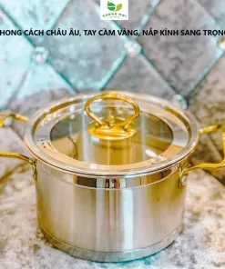 - Chất liệu: Inox 304 dày đẹp tay cầm vàng, nắp kính