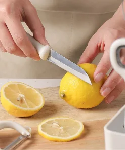 Bộ dụng cụ nhà bếp kèm khay bao gồm 5 món hỗ trợ công việc nội trợ như: dao, cây đánh trứng, bào rau củ, kéo và dụng cụ mở nắp bia.
