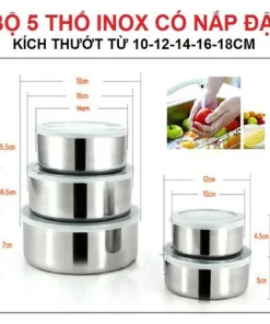 Bộ 5 thố bao gồm 5 thố với đường kính lần lượt là 10cm, 12cm, 14cm, 16cm và 18cm cho bạn thoải mái đựng các loại thực phẩm phù hợp kích cỡ và công năng để cất vào trong tủ lạnh và dễ dàng tìm kiếm khi cần dùng. Thố có nắp nhựa đậy kín hoàn toàn giúp bạn bảo quản thực phẩm an toàn và sạch sẽ. Bên cạnh đó thì chất liệu inox cao cấp bền, đẹp không gây hại cho sức khỏe nên bạn hoàn toàn có thể yên tâm khi sử dụng
