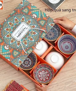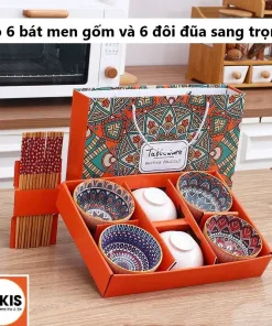 - Bộ 6 bát ăn bằng gốm và 6 đôi đũa bằng gỗ hội tụ đầy đủ các yếu tố để làm nên một món quà tặng hoàn hảo: Ý nghĩa, thực tế, có giá trị sử dụng cao – Chất lượng vượt trội – Giá trị thẩm mỹ cao, được trang trí họa tiết thủ công tinh xảo, đẹp mắt – Giá thành phải chăng, phù hợp với điều kiện kinh phí của mọi cá nhân hay doanh nghiệp.