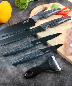 – Bộ sản phẩm gồm 5 món: 4 con dao, 1 dụng cụ gọt vỏ trái cây. Tiện dụng và phù hợp với nhu cầu đa dạng.