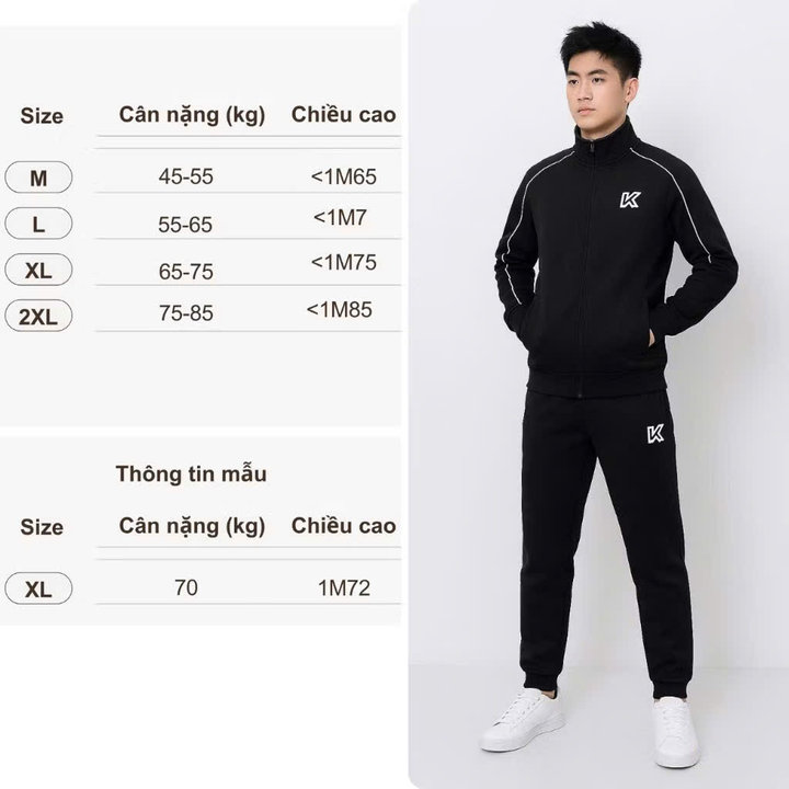 - Áo Khoác Kéo Khóa & Quần Jogger Dáng Suông Rộng: Cấu trúc form chuẩn, ôm vừa vặn (Form Slim Fit) nhưng vẫn tạo sự cử động thoải mái tối đa cho mọi hoạt động.