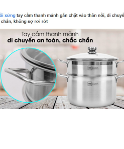 - Bộ nồi xửng tay cầm thanh mảnh gắn chặt vào thân nồi, di chuyển chắc chắn, không sợ rơi rớt
