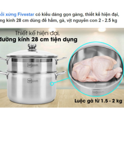 - Bộ nồi xửng Fivestar có kiểu dáng gọn gàng, thiết kế hiện đại, đường kính 28 cm dùng để hầm, gà, vịt nguyên con 2 – 2.5 kg