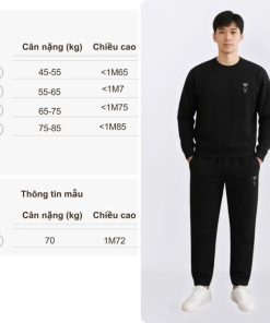 - Thiết kế: Áo cổ tròn, Quần dài suông/jogger có dây rút, Logo thêu.