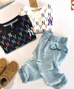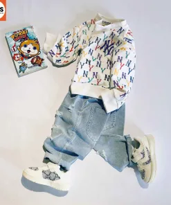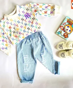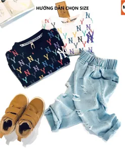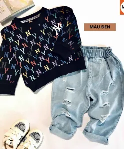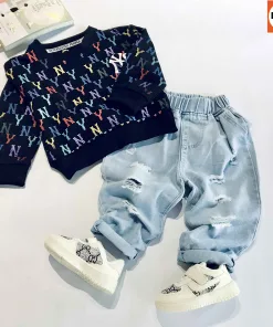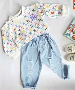- Áo nỉ chất liệu cao cấp co giãn nhẹ màu sắc đẹp tươi sáng, bắt mắt. Quần Jean xanh, mài xơ phía trước, co giãn 4 chiều, thấm hút mồ hôi tốt. Không bị xù lông, an toàn và không gây ngứa cho bé.