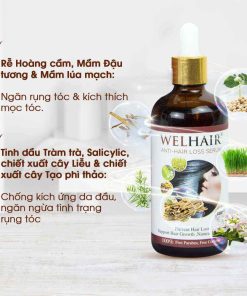 - Thành phần Serum Kích Thích Mọc Tóc Ngăn Rụng Tóc Welhair: Chiết xuất Rễ Hoàng cầm, Mầm Đậu tương và mầm Lúa mạch, Tinh dầu Tràm trà, chiết xuất cây Liễu, cây Tạo