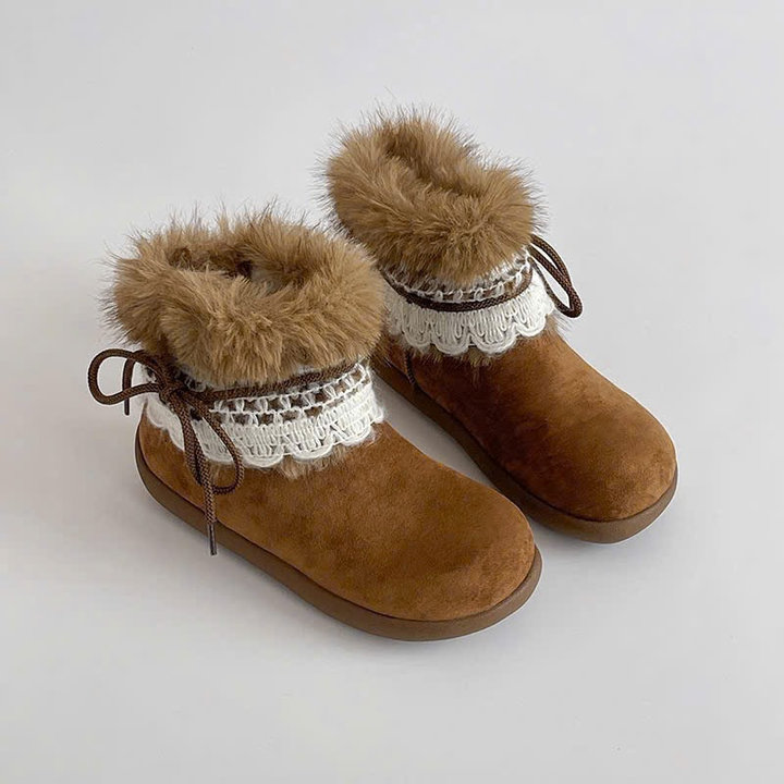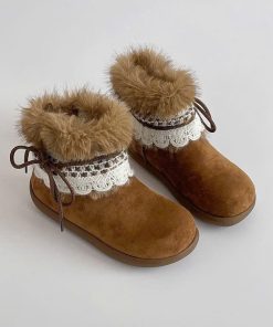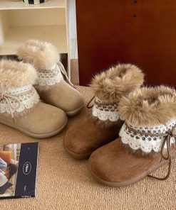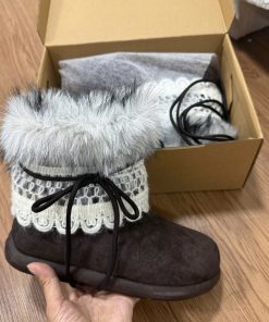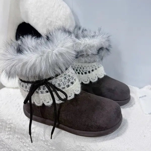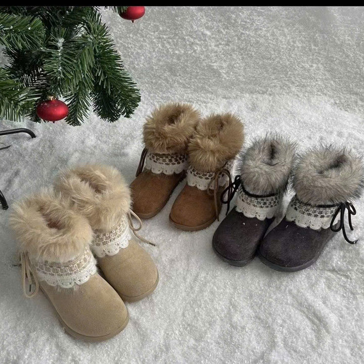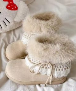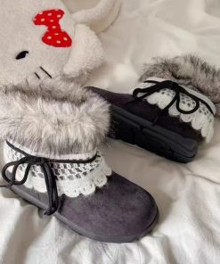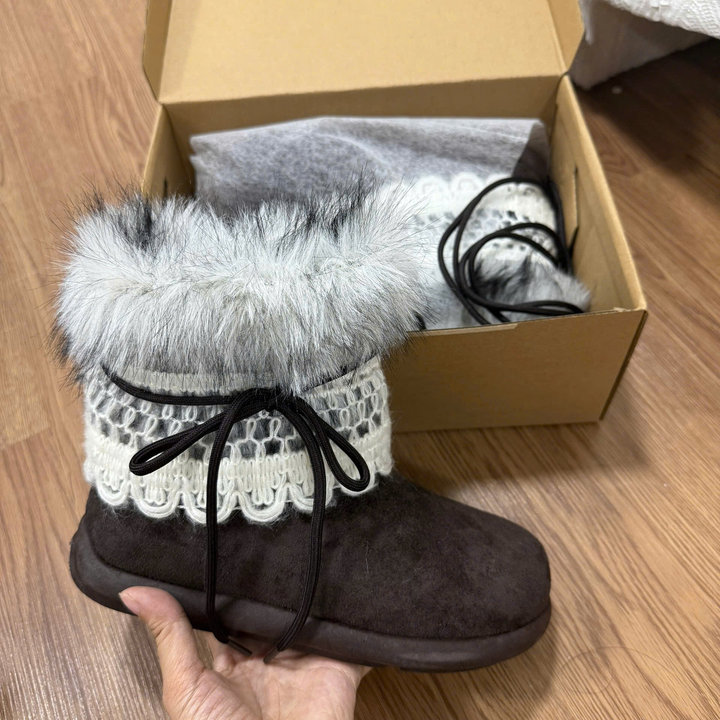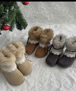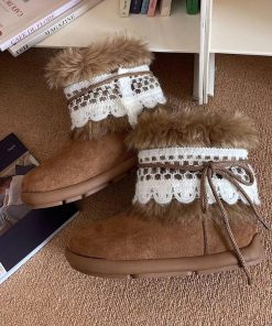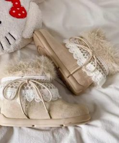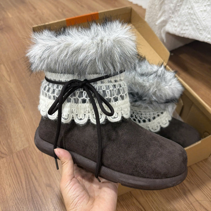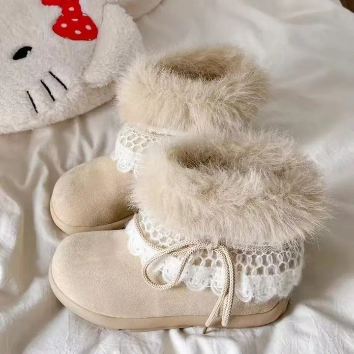 Thiết kế mềm mại, cổ lông bông mịn ấm áp kết hợp viền ren tinh tế – tôn nét nữ tính và dễ thương trong từng bước chân 👢✨