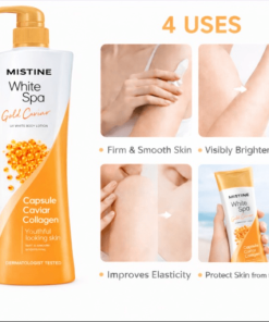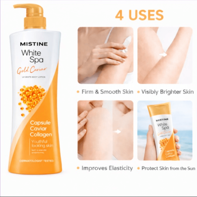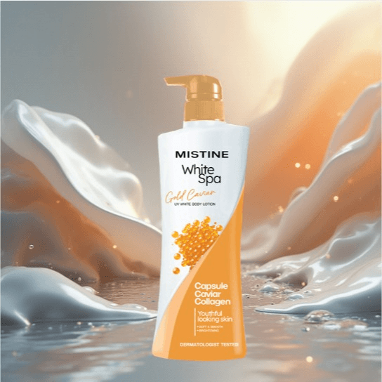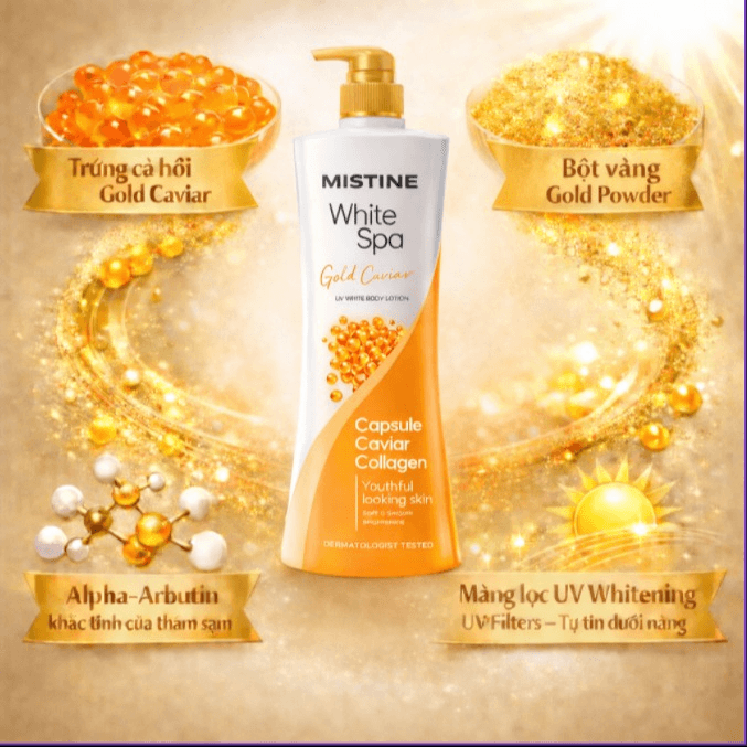 Dưỡng thể MISTINE WHITE SPA GOLD CAVIAR UV WHITENING LOTION là dòng dưỡng thể làm ẩm và sáng da toàn thân từ tinh hoa của biển cả, nổi bật với chiết xuất bột vàng giúp thúc đẩy lưu thông máu kích thích sản sinh Collagen giúp da không chỉ trắng mà còn săn chắc, trứng cá hồi Pháp (Gold Caviar) giàu dinh dưỡng giúp nuôi dưỡng tế bào da từ sâu bên trong và Alpha-Arbutin (khắc tinh của thâm sạm) giúp ức chế hắc tố melanin giúp làm trắng da an toàn bền vững và làm đều màu các vùng da cháy nắng, sản phẩm tập trung vào việc ngăn ngừa các vấn đề lão hóa sớm và vết thâm.