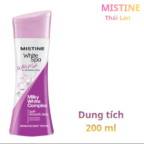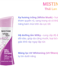 Dưỡng thể MISTINE WHITE SPA WHITE MUSK UV WHITENING LOTION là dòng dưỡng thể có hương thơm đặc trưng và lôi cuốn nhất của nhà Mistine. Với sự kết hợp giữa hiệu quả dưỡng ẩm chuyên sâu và hương nước hoa Xạ hương trắng (White Musk), đây là sản phẩm hoàn hảo cho những quý cô muốn có làn da mướt mịn, vừa mang mùi hương cơ thể quyến rũ.