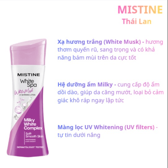 Để phù hợp với khí hậu nắng nóng tại Thái Lan và Việt Nam nên Mistine đã nghiên cứu và cho ra dòng dưỡng thể MISTINE WHITE SPA WHITENING LOTION ngoài công dụng dưỡng ẩm, làm trắng sáng da thì hầu hết các sản phẩm trong dòng này đều được bổ sung các bộ lọc tia UV (UV filters) giúp bảo vệ da khỏi tác hại của ánh nắng mặt trời và ô nhiễm môi trường.