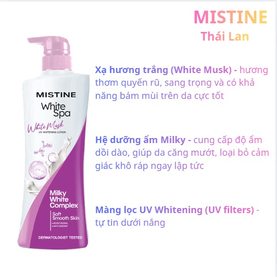 Để phù hợp với khí hậu nắng nóng tại Thái Lan và Việt Nam nên Mistine đã nghiên cứu và cho ra dòng dưỡng thể MISTINE WHITE SPA WHITENING LOTION ngoài công dụng dưỡng ẩm, làm trắng sáng da thì hầu hết các sản phẩm trong dòng này đều được bổ sung các bộ lọc tia UV (UV filters) giúp bảo vệ da khỏi tác hại của ánh nắng mặt trời và ô nhiễm môi trường.