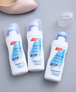– Thành phần: nước tinh khiết, Cilicate Flour, Glycerin… giúp tẩy trắng mà vẫn giữ an toàn cho da giày, da túi xách;