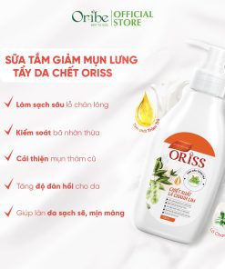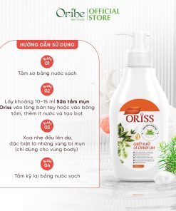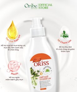 Sữa tắm giảm mụn Oriss với thành phần chủ yếu là chiết xuất lá chanh lim kết hợp với tinh dầu tràm trà giúp làm sạch sâu lỗ chân lông, kiểm soát bã nhờn dư thừa, cải thiện mụn thâm cũ và ngăn ngừa mụn mới, tăng độ đàn hồi cho da, cho làn da sạch sẽ mịn màng