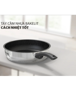 Tay cầm làm từ bakelit chịu nhiệt siêu bền, được bắt vít chắc chắn vào thân chảo, đảm bảo an toàn trong quá trình sử dụng, nâng nhấc, di chuyển. Phía cuối tay cầm còn được thiết kế lỗ treo móc giúp treo lên gọn gàng khi không sử dụng, tạo sự thẩm mỹ cho không gian.