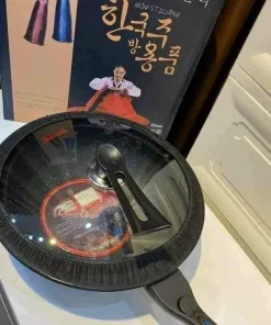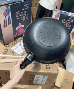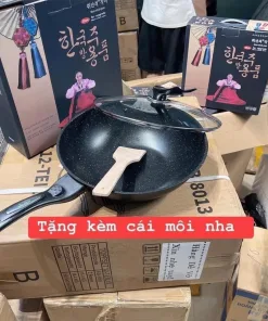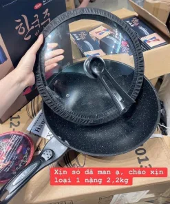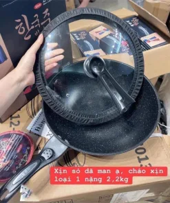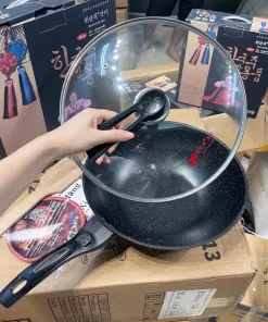 Sản phẩm chảo đá chống dính có nắp đậy thuỷ tinh, xuất xứ Hàn Quốc, có tặng kèm thìa gỗ.
