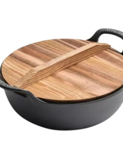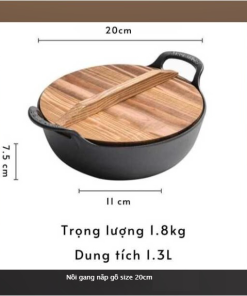 NỒI GANG/CHẢO GANG SÂU LÒNG ĐÚC NGUYÊN KHỐI CHỐNG DÍNH KÈM NẮP GỖ 20CM