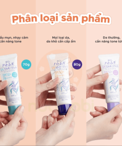 – Kem Chống Nắng Hatomugi The Tone Up UV Milky Gel UV Care & Tone Up SPF50+ PA++++ (Xanh Bạc Hà) 70g: Da dầu mụn, nhạy cảm cần nâng tone và che khuyết điểm.