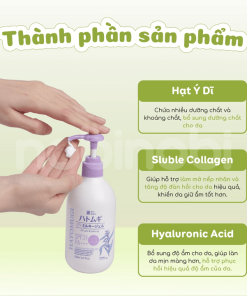 – Thành phần chính có trong sữa dưỡng thể Hatomugi là hạt Coix (hạt ý dĩ) chứa hàm lượng lớn acid béo và vitamin giúp nuôi dưỡng, cân bằng làn da. Ngoài ra, thành phần hạt Coix còn có tác dụng thúc đẩy quá trình sản sinh chất giữ ẩm tự nhiên, giúp da luôn căng mọng, khỏe mạnh, mịn màng và hạn chế tình trạng xuất hiện nếp nhăn trên da.