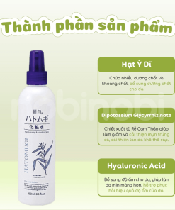 Xịt Khoáng Dưỡng Ẩm làm sáng mịn Hatomugi là xịt khoáng thuộc thương hiệu Hatomugi Nhật Bản chứa chiết xuất Ý Dĩ giúp cung cấp độ ẩm sâu, làm mát da sau khi đi nắng. Tăng cường khả năng hấp thụ dưỡng chất từ các sản phẩm sữa dưỡng và kem dưỡng, đồng thời giúp cải thiện làn da mềm mại, ẩm mịn hơn.