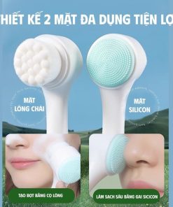 + Thiết kế cọ gồm 2 đầu là đầu tơ nhân tạo và đầu gai silicon 3D:Đầu tơ nhân tạo: 250000 sợi tơ nhân tạo loại bỏ bụi bẩn, bã nhờn, làm sạch sâu từng lỗ chân lông, ngăn ngừa da phát sinh mụn, hỗ trợ thu nhỏ lỗ chân lông.Đầu gai silicon 3D: giúp massage da, hỗ trợ lưu thông máu và giúp da được thư giãn, mang lại làn da khỏe mạnh hơn.Công dụng của cọ rửa mặt massage đó là: