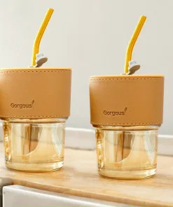 - Tên sản phẩm: Cốc Thủy Tinh Có Nắp Bọc Da, Ống Hút 450ml – Sương Mai