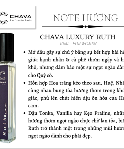 - Đậu Tonka, Vanilla hay Kẹo Praline, những hương thơm ngọt ngào chực chờ lan tỏa, biến Ruth trở thành một trong những mùi hương ngọt ngào dành cho phái đẹp.