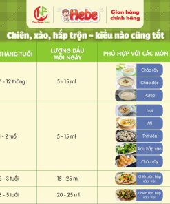 -Dầu Olive Extra Virgin Hebe dành riêng cho trẻ trong giai đoạn ăn dặm, với thành phần 100% Olive nguyên chất từ Italia…Dầu Olive Extra Virgin Hebe chứa hàm lượng lớn Omega 3, Omega 6 những chất béo có chứa trong sữa mẹ giúp não bộ và thể chất của bé phát triển toàn diện, giúp bé thoát khỏi tình trạng còi xương, chậm lớn, hệ thầnkinh phát triển tốt phản xạ nhanh nhẹn và ngày càng thông minh.Dầu Olive Hebe còn là nguồn cung cấp Vitamin A dồi dào giúp cho đôi mắt bé sáng khỏe da dẻ hồng hào. Vitamin E có trong dầu Olive Hebe.