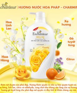 Sữa tắm hương nước hoa Enchanteur Charming giúp làm sạch tế bào c.hết và sậm màu, đẩy nhanh quá trình tái tạo tế bào mới. Sản phẩm với công thức mới chứa gấp đôi hàm lượng chất dưỡng da Silk Protein cho làn da mềm mịn như lụa. Sữa tắm giàu dưỡng chất từ kem sữa tươi và Vitamin B3 giúp da trắng sáng đồng thời bổ sung dưỡng ẩm cho làn da mềm mịn. Cùng với hương nước hoa Pháp sẽ khiến bạn càng thêm tự tin, duyên dáng với làn da tươi trẻ của mình.