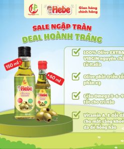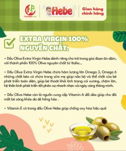 -Dầu Olive Extra Virgin Hebe dành riêng cho trẻ trong giai đoạn ăn dặm, với thành phần 100% Olive nguyên chất từ Italia…Dầu Olive Extra Virgin Hebe chứa hàm lượng lớn Omega 3, Omega 6 những chất béo có chứa trong sữa mẹ giúp não bộ và thể chất của bé phát triển toàn diện, giúp bé thoát khỏi tình trạng còi xương, chậm lớn, hệ thầnkinh phát triển tốt phản xạ nhanh nhẹn và ngày càng thông minh.Dầu Olive Hebe còn là nguồn cung cấp Vitamin A dồi dào giúp cho đôi mắt bé sáng khỏe da dẻ hồng hào. Vitamin E có trong dầu Olive Hebe